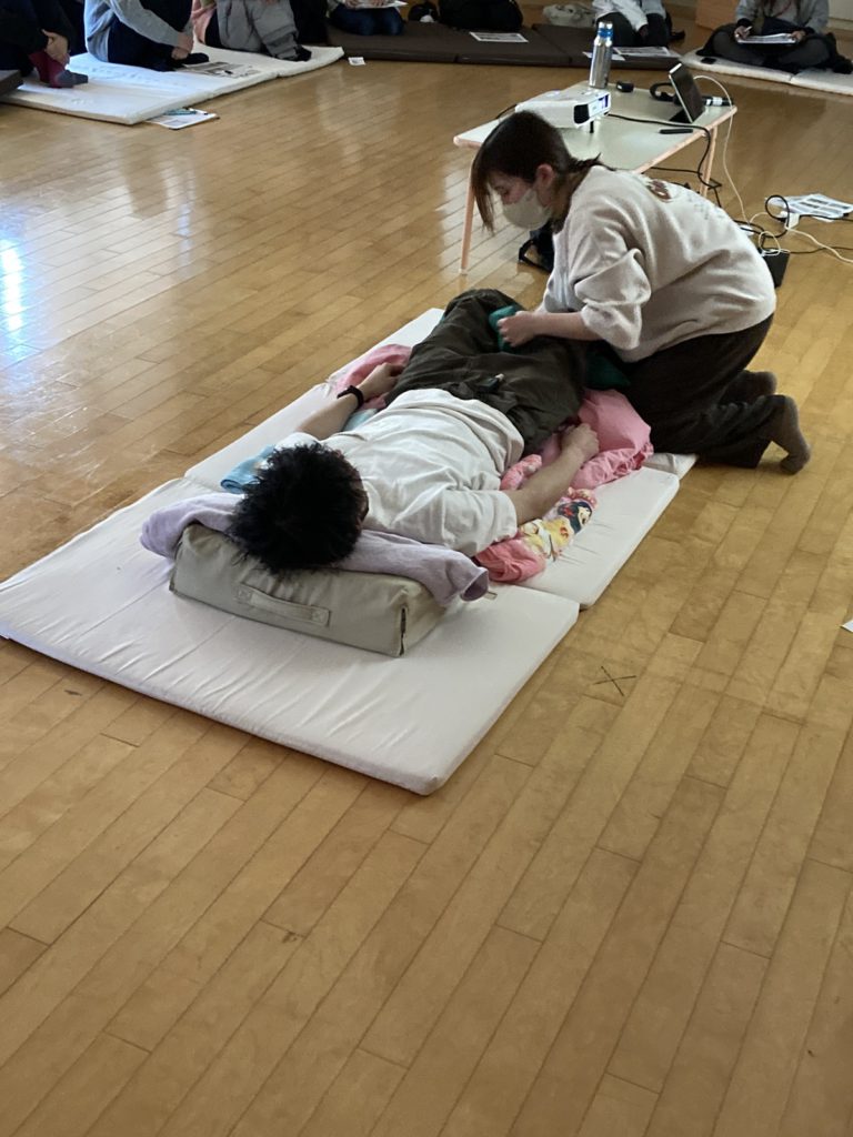 お子さんへの触れ方や身体を動かすための基本的な方法、関節可動域訓練、ポジショニングの方法、活動における体への効果についてなど、実技を交えながら学びました。